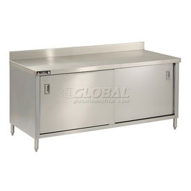 Economy Cabinet, 2-3/4" Backsplash, Sliding Doors, Galv. 30 x 72 This cabinet measures 30"D x 72"W with a 16 Gauge, 340 Type Stainless Steel Top, a 2" turn down on 3 sides. Includes a 2-3/4" backsplash and an 18 Gauge galvanized steel body. Built with sturdy legs 16 Gauge 1-5/8" O.D. with 1" adjustable feet. Sliding are 18 Gauge galvanized steel with nylon roller bearing sheaves. Welded construction provides extra strength and durability. Gussets are fully welded for extra rigidity. Top is polished to a #4 mill finish. NSF Listed. 72.00 L. 35.00 W. 30.00 H.
