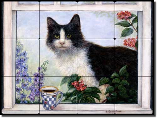 Ms. Cappuccino by Carolyn Paterson - Coffee Cat Tumbled Marble Tile Mural 12" x 16" Kitchen Shower Backsplash Feature