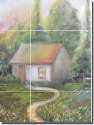 Cottage at Dawn by Karen J. Lee - Country Landscape Ceramic Tile Mural 24" x 18" Kitchen Shower Backsplash Feature