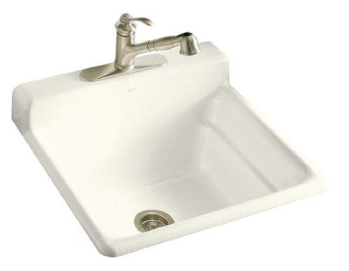 Kohler K-6608-1-96 Bayview Self-Rimming Utility Sink with Single-Hole Faucet Drilling on Top of Backsplash, BiscuitThe Bayview single-basin utility sink is ideal for the hardest-working rooms of the home. This self-rimming unit features durable KOHLER® Cast Iron construction, a single-hole faucet drilling on the front of the integrated backsplash, and a generous 11" basin depth.Kohler K-6608-1-96 Bayview Self-Rimming Utility Sink with Single-Hole Faucet Drilling on Top of Backsplash, Biscuit Features:; Single-basin utility sink with installation and faucet options; 25-1/2"L x 24"W x 11"D; Sink models available with a two-hole faucet drilling in backsplash and with a three-hole faucet drilling on top of backsplash; For self-rimming countertop installation; sink model available with black painted underside for installation in optional wood sink stand; Kohler Cast Iron Lifetime Limited Warranty